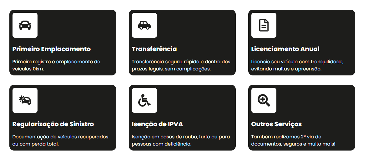 Foram incorporadas as áreas de CFC Auto Escola, Corretora de Seguros e Isenções, garantindo a excelência na execução dos nossos serviços, o que nos traz como retorno a completa satisfação dos nossos clientes.